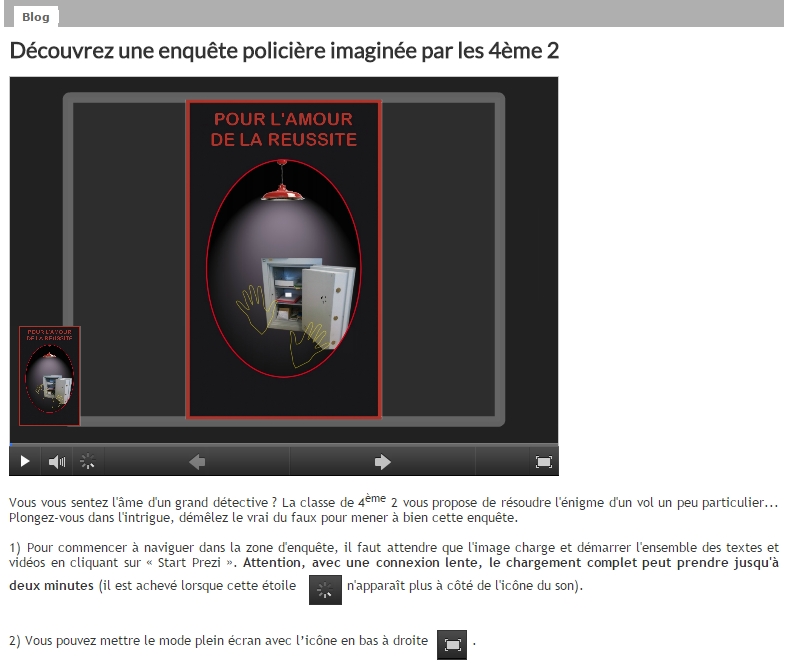 Ensuite, pour des questions de temps, le travail a été mutualisé : par groupes de trois élèves, ils ont produit, en salle informatique, un texte sur les huit mots restants puis ont mis en scène leur mot (lecture enregistrée ou petite saynète). J’ai récupéré, toujours via l’ENT, toutes leurs productions et les ai mises dans un diaporama (Prezi), lui aussi intégré dans l’ENT, dans un article de blog. (Remarque : puisqu’il s’agissait d’un blog de classe créé pour l’année 2014-2015, il n’est plus accessible. Cependant, vous pouvez accéder à la présentation)