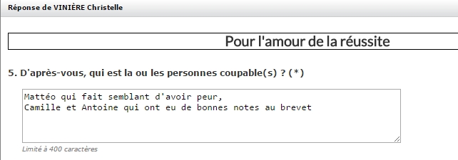 Ensuite, j’ai évalué les élèves sur leurs productions de textes liés à l’enquête (respect de la cohérence par rapport au scénario, utilisation pertinente des dix mots de la langue française, structure, etc...) et leur capacité à les améliorer. En outre, leurs mises en voix étaient également évaluées sur la qualité de la diction.