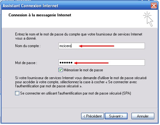 • Dans "Nom du compte", saisir son identifiant, et compléter son mot de passe. Pour plus de confort, celui-ci peut être mémorisé. Cliquer sur "Suivant", puis "Terminer".