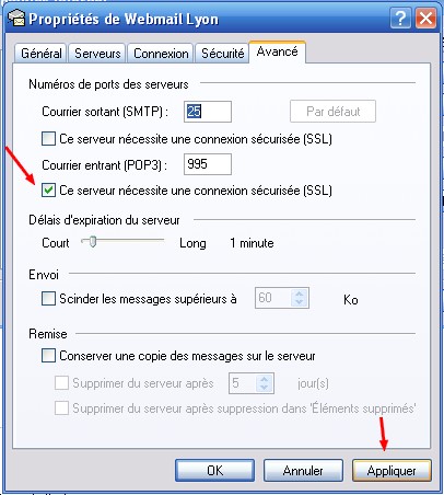 • Dans "Avancé", cocher "Ce serveur nécessite une connexion sécurisée (SSL).", puis cliquer sur "Appliquer", "Ok".