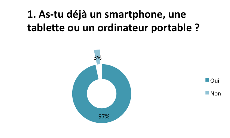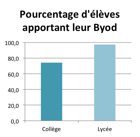 Alors que le premier frein à l’utilisation du BYOD en classe est celui de l’équipement, nous avons cherché, dans un premier temps, à déterminer de quel matériel les élèves disposaient. Si 97% des élèves sont en possession d’un équipement numérique, avec peu d’écart entre collégiens et lycéens (94,6% pour les uns et 98,7% pour les autres), la quasi-totalité des élèves de lycée l’apportent à l’école (97,5%) contre 74,3% au collège.