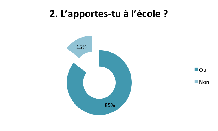 Parmi ceux qui avaient déjà utilisé leur matériel en classe, nous avons cherché à savoir ce qu’ils en avaient fait. L’utilisation du BYOD dans le cadre du cours semble majoritairement concerner la recherche d’informations et la prise de photographies. Plus de 20% des élèves ont répondu que le BYOD a pu servir à d’autres usages : quizz mais aussi en support aux cours de langue (compréhension orale ou aide à la traduction avec des exemples comme Kahoot ou Quizlet), Google Map, QR-Code, calculatrice et chronomètre ou encore des images à reproduire sur le téléphone.