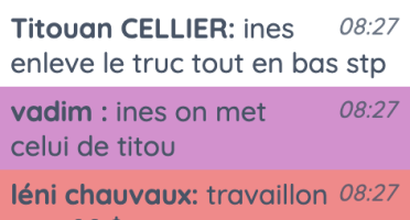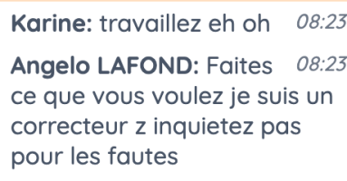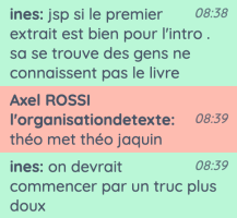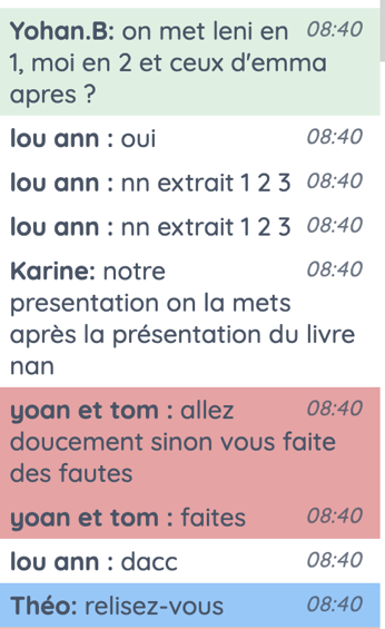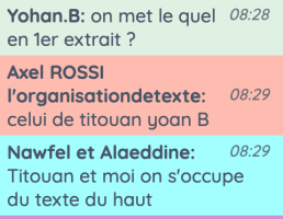 Dans le chat, ils se sont réparti eux-mêmes les rôles. L’un d’entre eux accole naturellement à son nom « organisation du texte ». Ayant terminé avant ses pairs sa rédaction, il veille à la limpidité dans l’enchainement des paragraphes. D’autres proposent d’eux-mêmes leur aide en grammaire ou suggèrent à leurs camarades de développer certains aspects thématiques. Framapad permet de ne pas décourager les élèves, ils peuvent revenir sur le texte, l’étoffer et apporter de la nuance : le mélange d’interaction synchrone et asynchrone est un avantage du point de vue du processus rédactionnel.